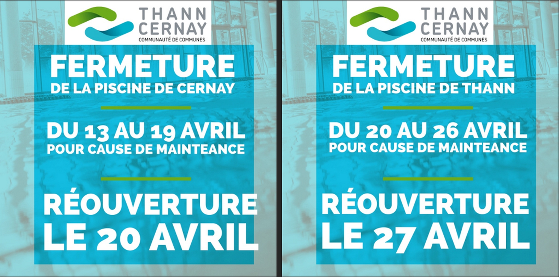 La piscine intercommunale de Cernay sera fermée pour sa maintenance annuelle du 13 au 19 avril inclus et la piscine intercommunale de Thann sera fermée pour sa maintenance annuelle du 20 au 26 avril inclus.